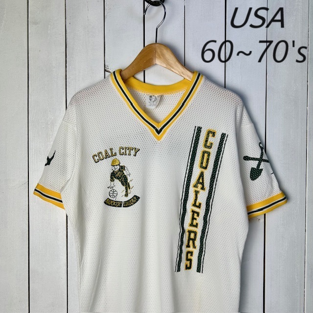 > T●354 USA古着 60s~70s チープキャラ Vネック メッシュゲームシャツ S~M 白 オールド ヴィンテージ アメリカ古着 Tシャツ