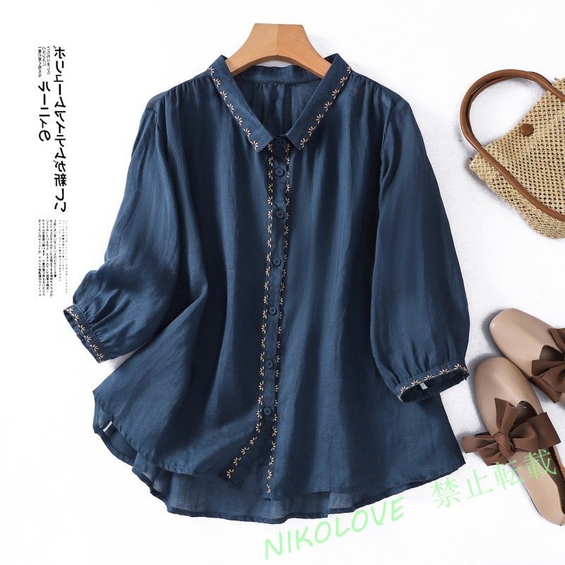 - 新品夏 秋 刺繍り シャツ おしゃれ チュニック レディース 七分袖 ブラウス トップス 大きいサイズブルー 2XLサイズ選択可 LC209