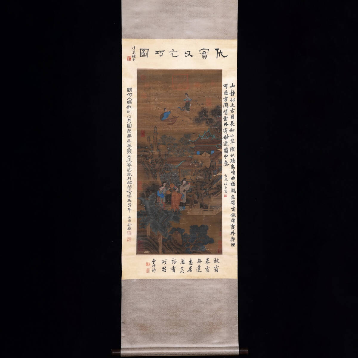 - 古美術 掛け軸 中国・明時代 「仇英書」 絹本 【七夕出会い図】 立軸 書道 巻き物 真筆逸品 肉筆保証 唐物 古画 LT-24943