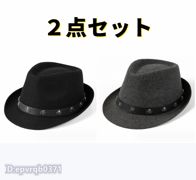 > 2点セット ソフト帽 新品 メンズキャップ ジャズハット スカル 紳士 帽子 中折れハット フリーサイズ 56-58センチ 黒/グレー