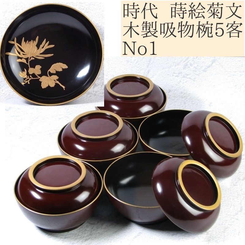 - 時代 木製 蒔絵菊文吸物椀5客 No1 幅:12.8cm 美品/煮物椀/24g052
