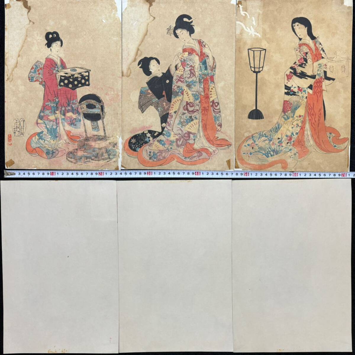 - 明治期/真作 楊洲周延 本物浮世絵木版画 美人画 錦絵 大判 三枚 裏打ち