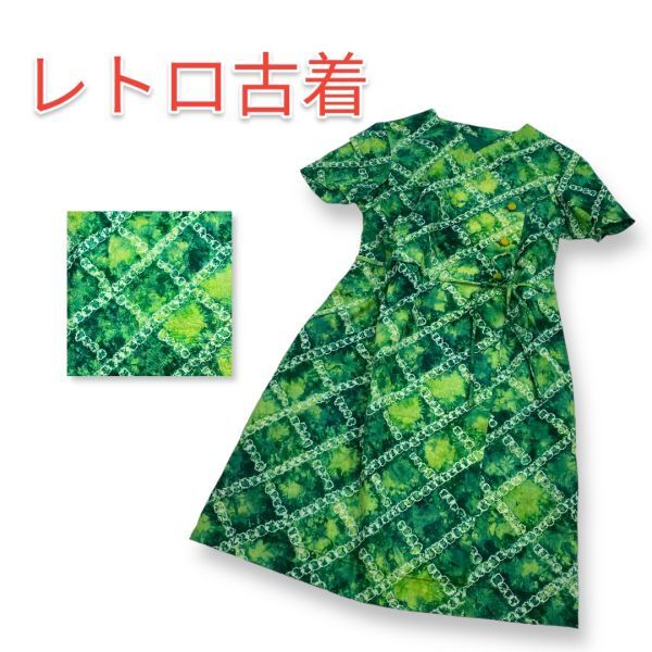 - 【レア】昭和レトロ ワンピース サイケ 総柄 タイダイ染 緑 グリーン ヴィンテージ ゆったり エレガント オートクチュール 特注品 匿名配送