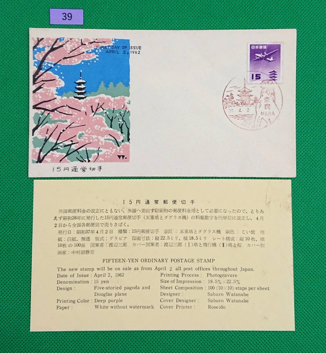 - FDC/美品/航空切手/円単位五重塔/15円/初日印/奈良風景印/中村浪静堂/解説書有り/1962年4月2日/初日カバー/№39
