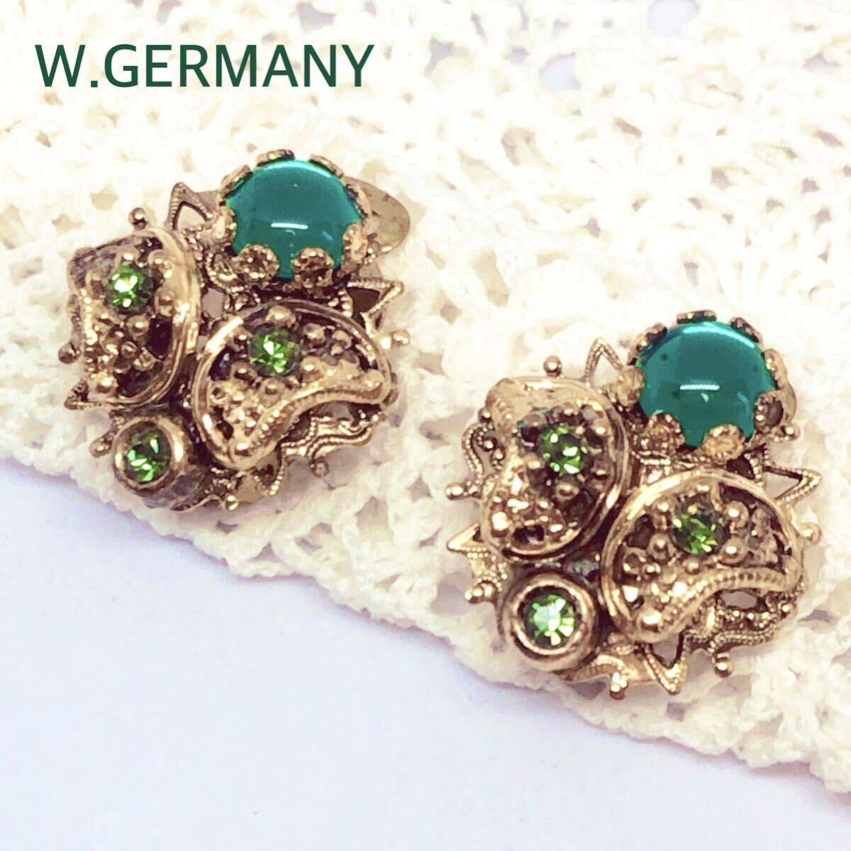 > W.GERMANY ヴィンテージ イヤリング 西ドイツ ラインストーン クリスタル ガラス ビジュー グリーン 緑 ゴールド カラー