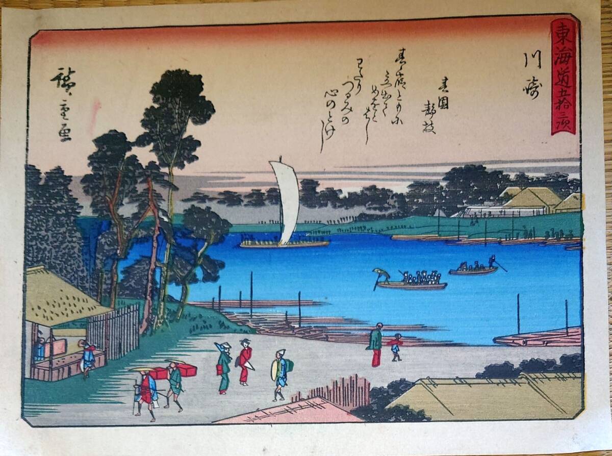 - f24040403〇彩色木版画 佐野喜版 狂歌入東海道五十三次 川崎宿 広重 複刻昭和年代〇和本古書古文書