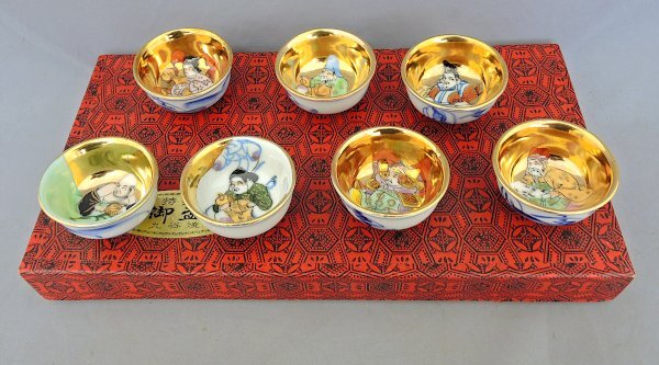 - 九谷 七福神 盃 SAKE CUP7客 酒盃 金彩 九谷焼 おちょこ 酒器 猪口 昭和レトロ 中古 KUTANI WARE made in Japan