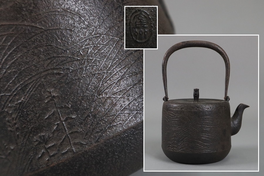 - 時代金工 釜師 金澤鶴斎 虫喰肌 秋草文 鉄瓶 1437g 未使用品 急須 鐵壷 湯沸 茶器 細密細工 古美術品[c1014]