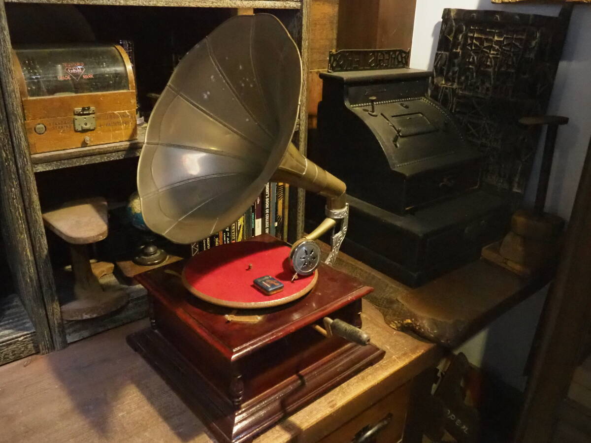 - 【ラッパ付き蓄音機】インテリア稼動品レコードプレーヤーSP盤ターンテーブル古道具アンティーク骨董インダストリアルハンドル