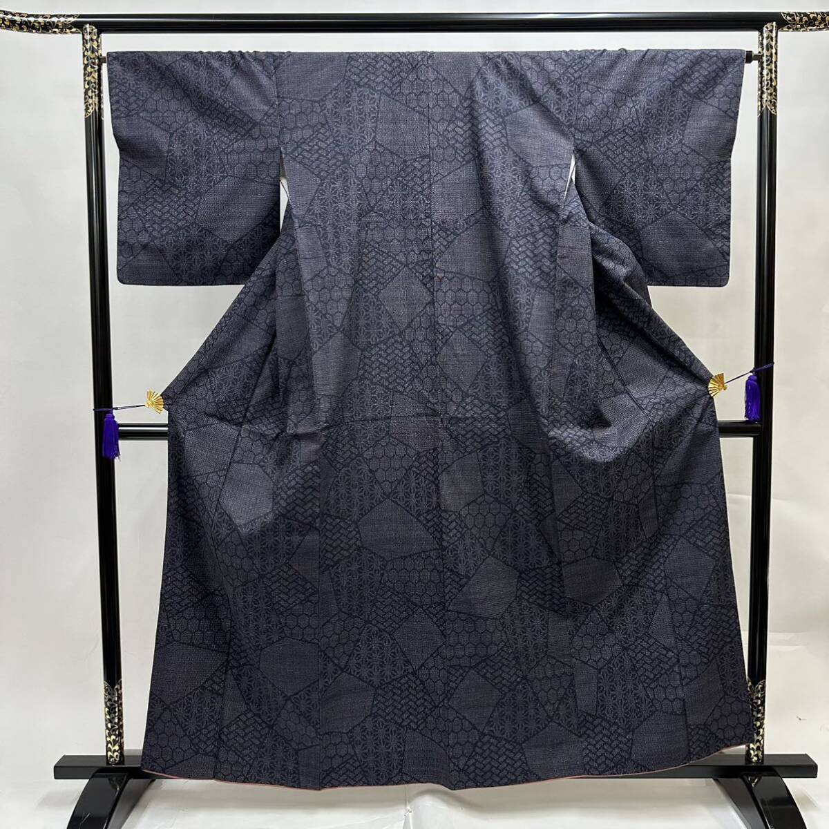 - 【七福】c242 切りばみ柄 紬 袷 着物 100亀甲絣 総絣 結城紬 身丈 約 158.5cm 裄 約 64.5cm