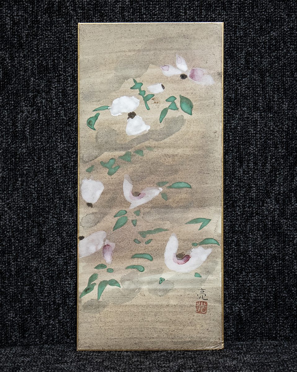 - 【真作】 光岡亮 山茶花 池田遙邨に師事 現代日本画 四季大短冊