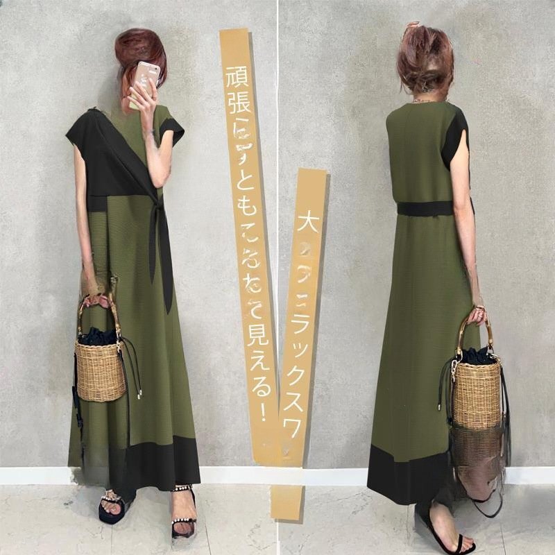 - 未使用 コットン麻風素材のマキシ丈ワンピカラーブロックがおしゃれ 後ろファスナーマキシ丈ワンピ Lサイズ