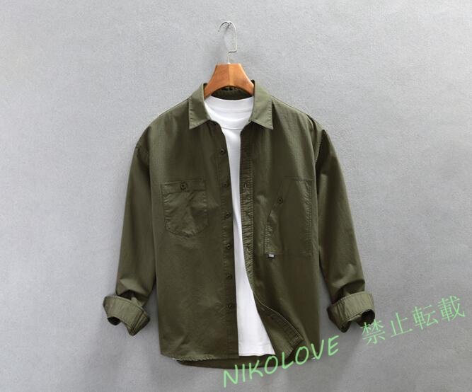 - 新品 お洒落 メンズ ミリタリーシャツ 長袖 無地 ポケット付き カジュアルシャツ コットンシャツ 快適 春夏秋服 グリーン LF681