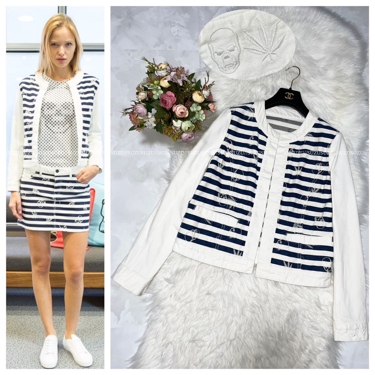 - 本物 名作 ルシアンペラフィネ スカル&ヘンプ 刺繍 ボーダー デニム ジャケット M オフホワイト×ネイビー 白系×紺 lucien pellat-finet