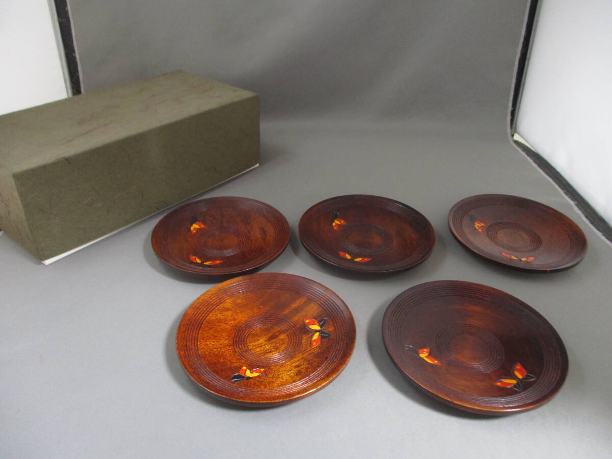 - ★銘々皿 5枚 木製 蝶の絵柄 径13.5cm ※少々汚れあり・箱に文字記載あり tm2409-8-1★