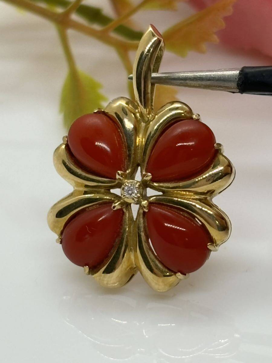 - K18 天然血赤本珊瑚 ダイヤモンド付き 国産 ペンダントトップ (s314)
