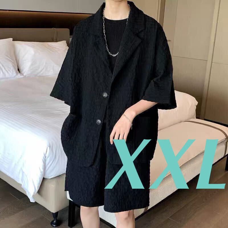 - セットアップ ジャケット パンツ 2点セット 部屋着 ワッフル ルームウェア ジャケパン 上下セット 短パンツ トレンド ストリート 黒 XXL