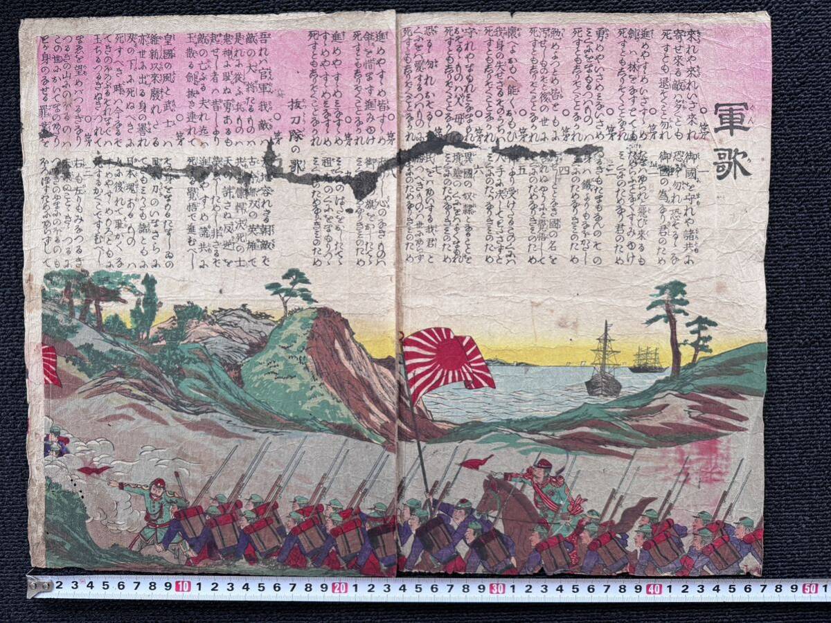 - 明治期/真作 梅窓政照「軍歌」本物浮世絵木版画 武者絵 戦争絵 錦絵 大判 二枚続き