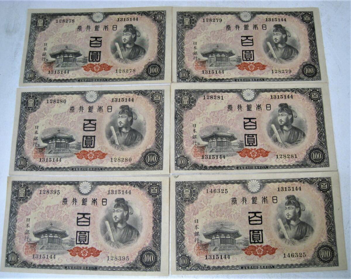 - 【東京 谷中 質屋おぢさん】極美品 旧紙幣 聖徳太子 4次 百円札 同組4連番プラス2枚 合計6枚