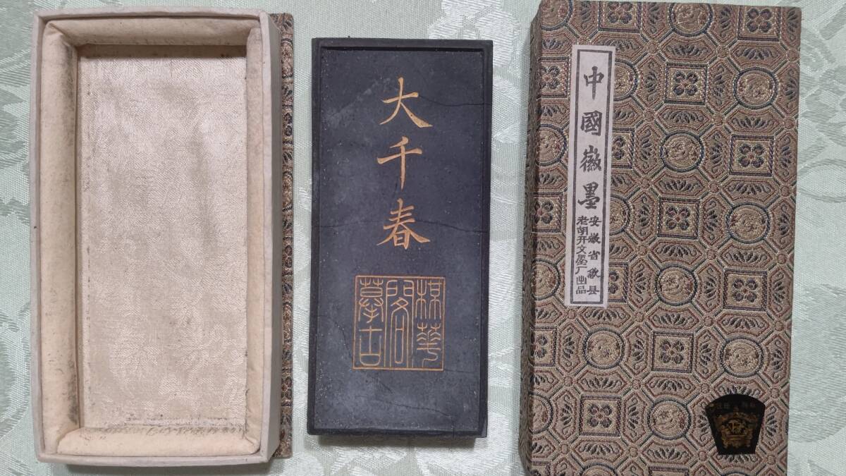 - 922-5 中国徽墨 徽州老胡開文製 大千春 8241910 唐墨 古墨 (13.5×6×1.9㎝ 192g)箱入り