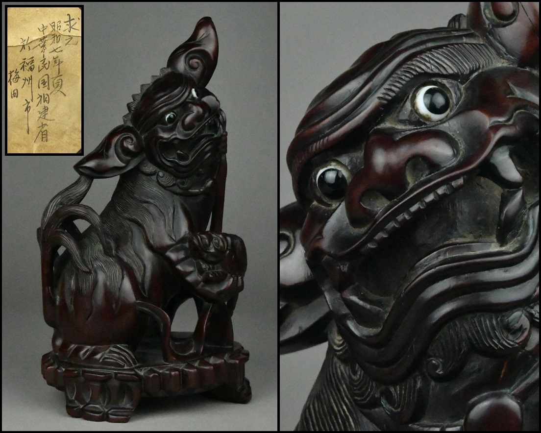 - 中国美術 唐物 唐木 龍眼木 玉眼 親子獅子彫刻 置物 床置 飾り物 古美術品 高さ29cm