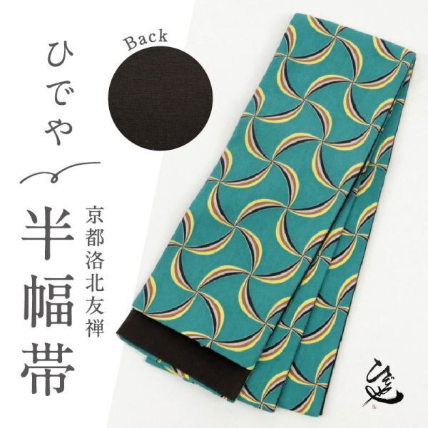 - 【半幅帯】 新品 『ひでや工房』 分銅つなぎ柄 京都洛北友禅 リバーシブル グリーン k24-29
