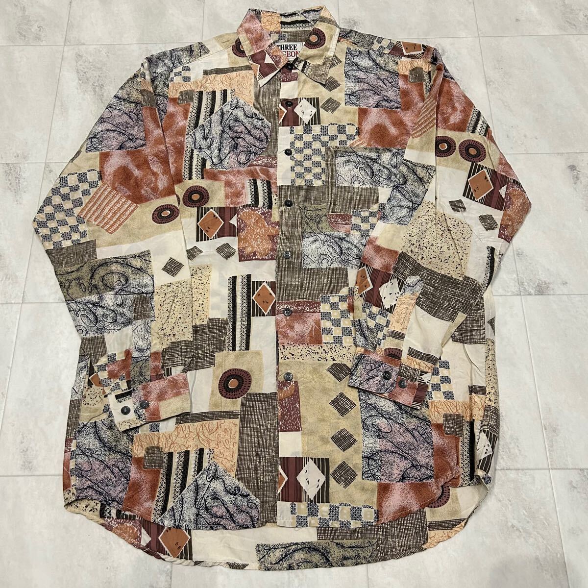 - THREE PIGION 総柄 柄シャツ レトロ アート ビンテージ 長袖シャツ 絹100%
