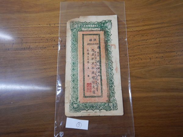 - 古銭 中国 新彊省 財政廳庫官票 no.3 紅銭肆百文 民国二十年11.3X20CM 1991年 カシュガル ウイグル自治区購入 専行客什道 票取足