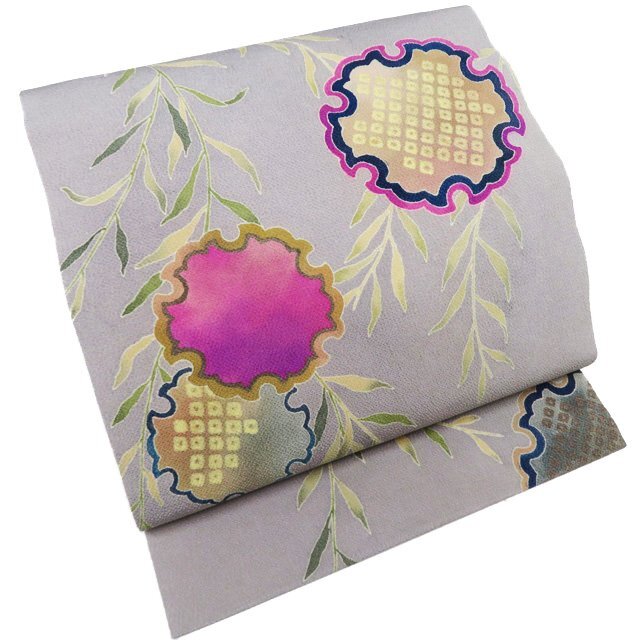 - 名古屋帯 なごや帯 中古 リサイクル 正絹 縮緬地 カジュアル 仕立て上がり 柳に雪輪の図 薄灰色 多色 きもの北條 A1095-17