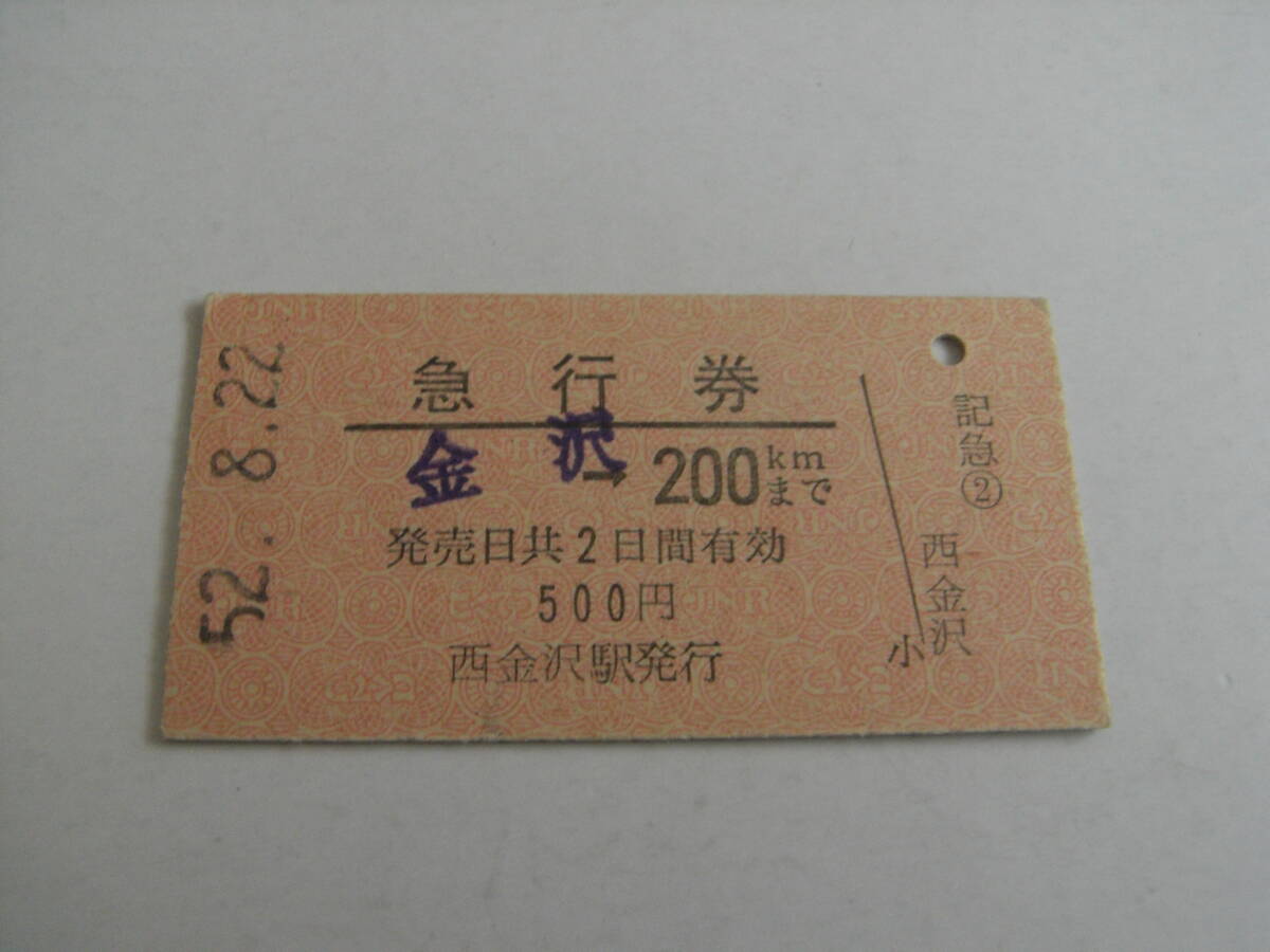 - 急行券 金沢→200kmまで 昭和52年8月22日 西金沢駅発行 北陸本線 国鉄