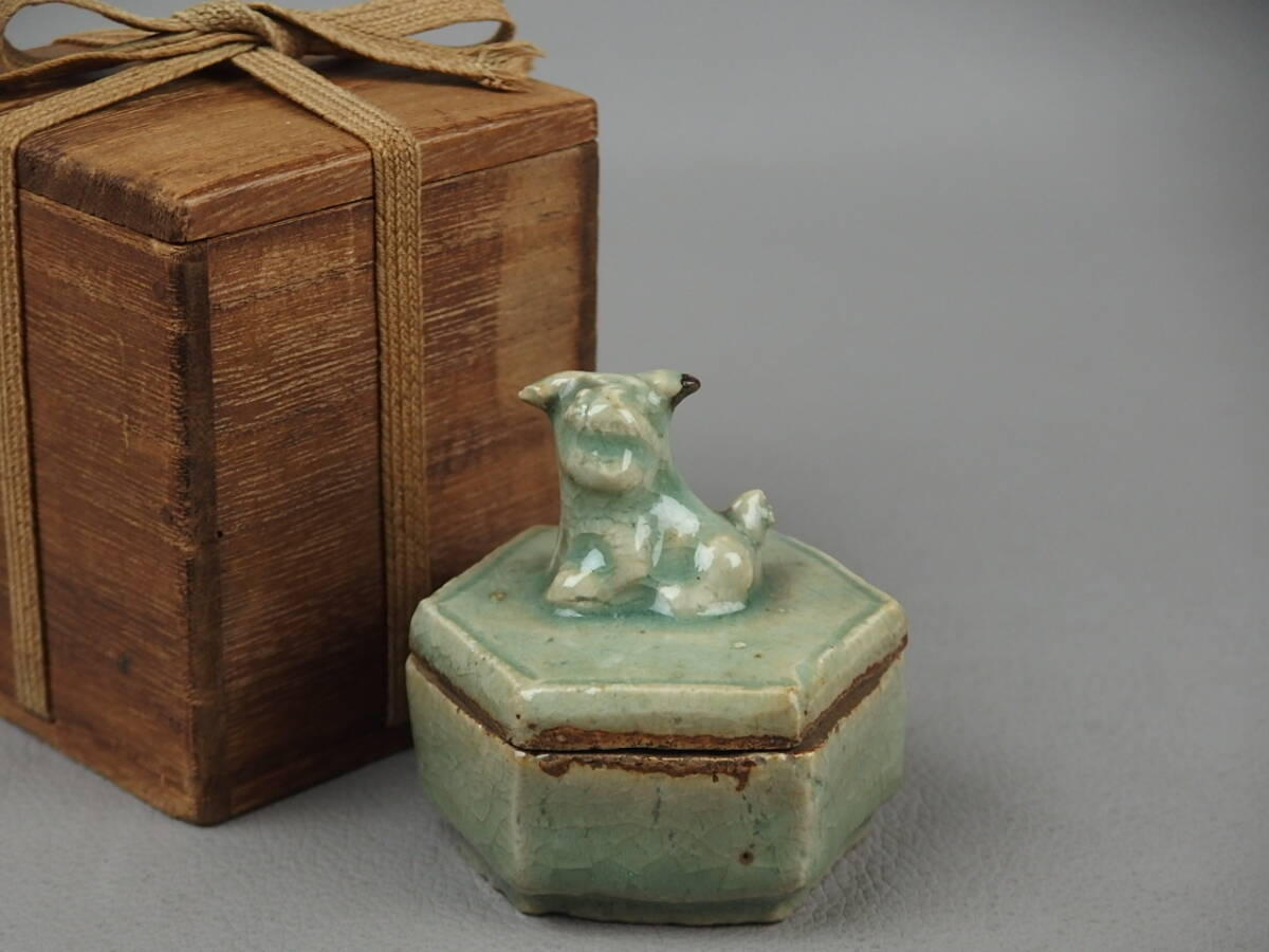 > 【骨董・茶道具】★中国古玩 明時代★★青磁獅子六角香炉 fp089ugl22.7 七官青磁 龍泉窯 香道具