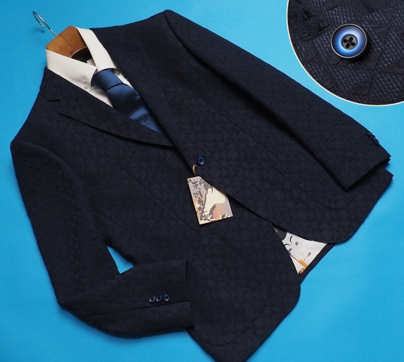 > 新品10.7万円 大手百貨店扱い 秋冬 完全日本製 [東洲斎写楽] 浮世絵裏地 立体ジャガード ジャケット/ブレザーM(AB5)紺(B) 3251460
