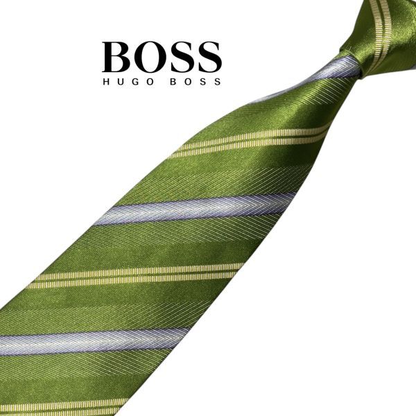 > ★美品★ストライプ柄★HUGO BOSS★高級ネクタイ ライトグリーン系 ヒューゴボス シルク USED プレス済み ネコポス可 t1059
