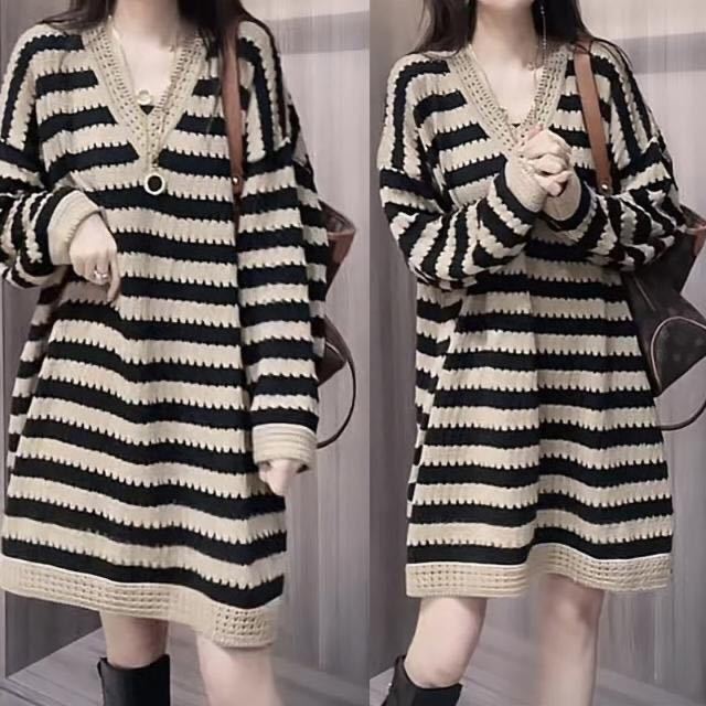 - ボーダーワンピース レディース ニット Vネック オーバーサイズ ボーダー柄 ワンピース 体型カバー ニットワンピース 春秋 セーター RLW002