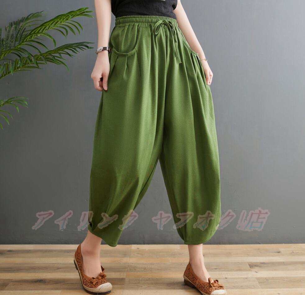 - ☆新品サイズ選択可 レディースパンツ ナチュラル ゆったり 無地 綿麻リネン ウエストゴム おしゃれ ワイドパンツ 緑