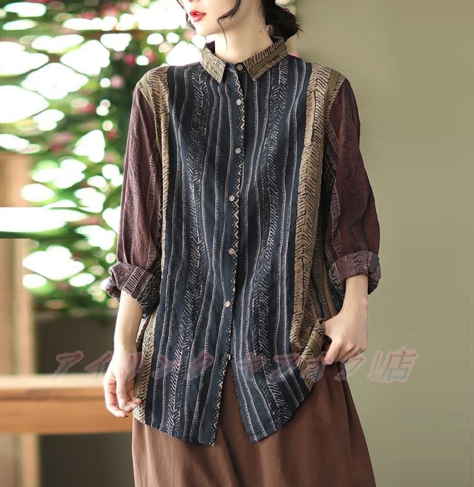 - ☆新品サイズ選択可 ゆったり ボーダー柄 可愛い大人 綿麻 おしゃれ 大きいサイズ 長袖 ブラウスシャツ トップス カーキ