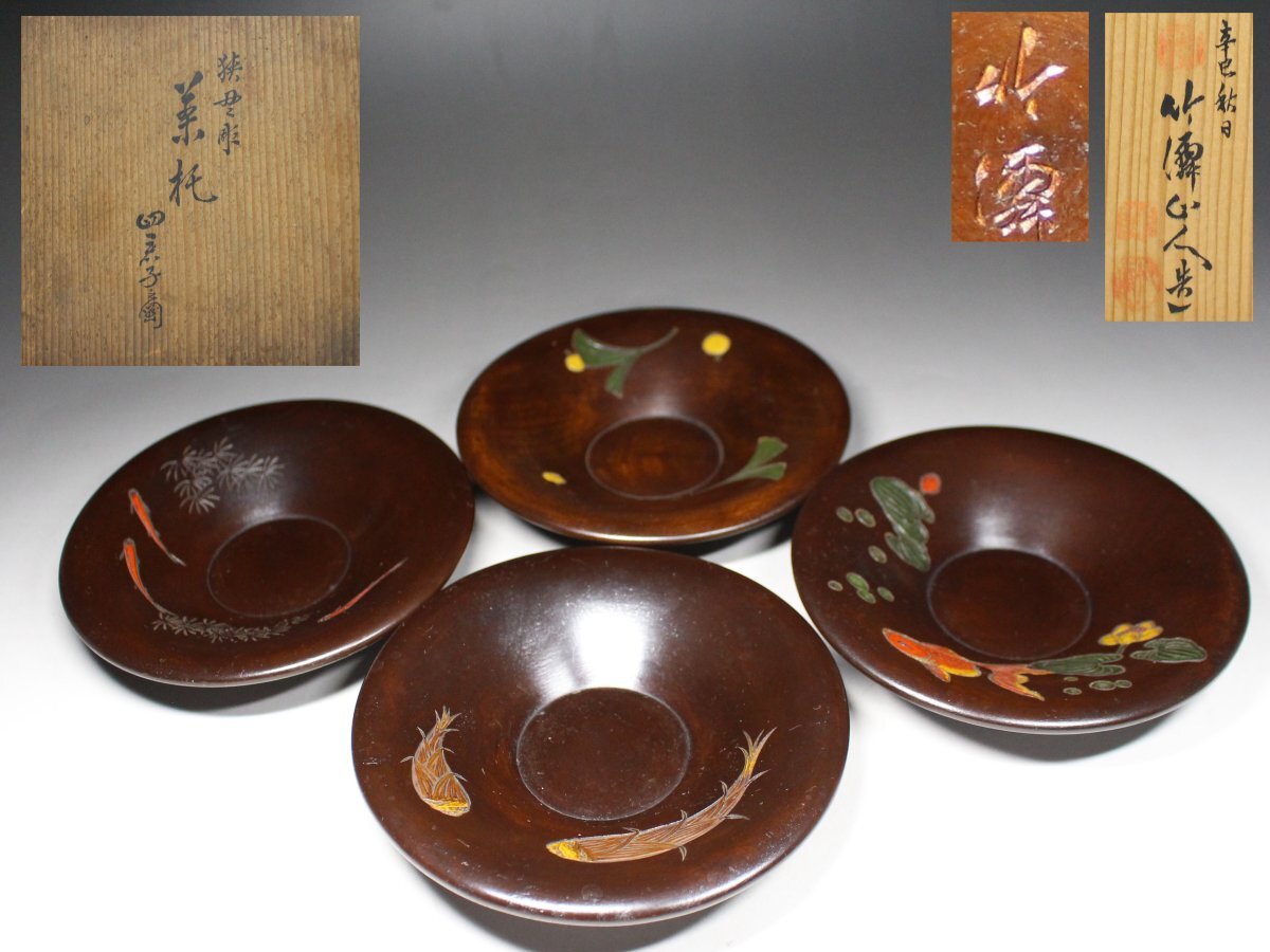 - ◆狭貫彫・讃岐彫・佐々竹僊 刀・絵替・茶托・4客・精密彫細工・天然木・茶道具・共箱◆a4144h