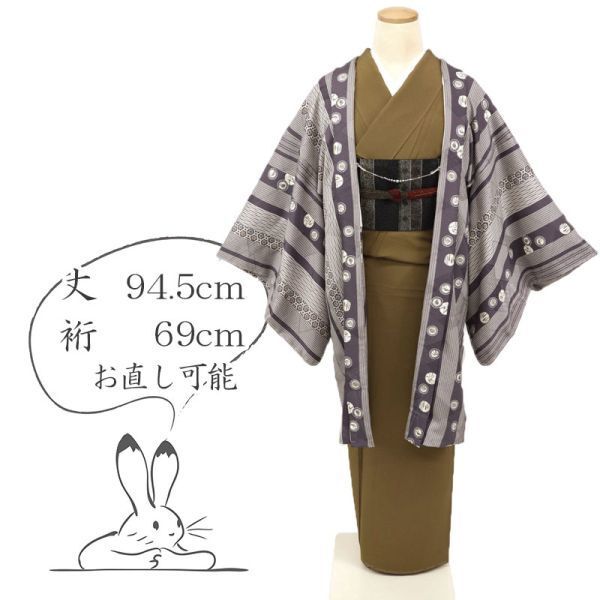 - 【羽織】 新品 変り縞にお野菜の丸文 紫鼠色 地紋入 正絹 着物上 CP3-8