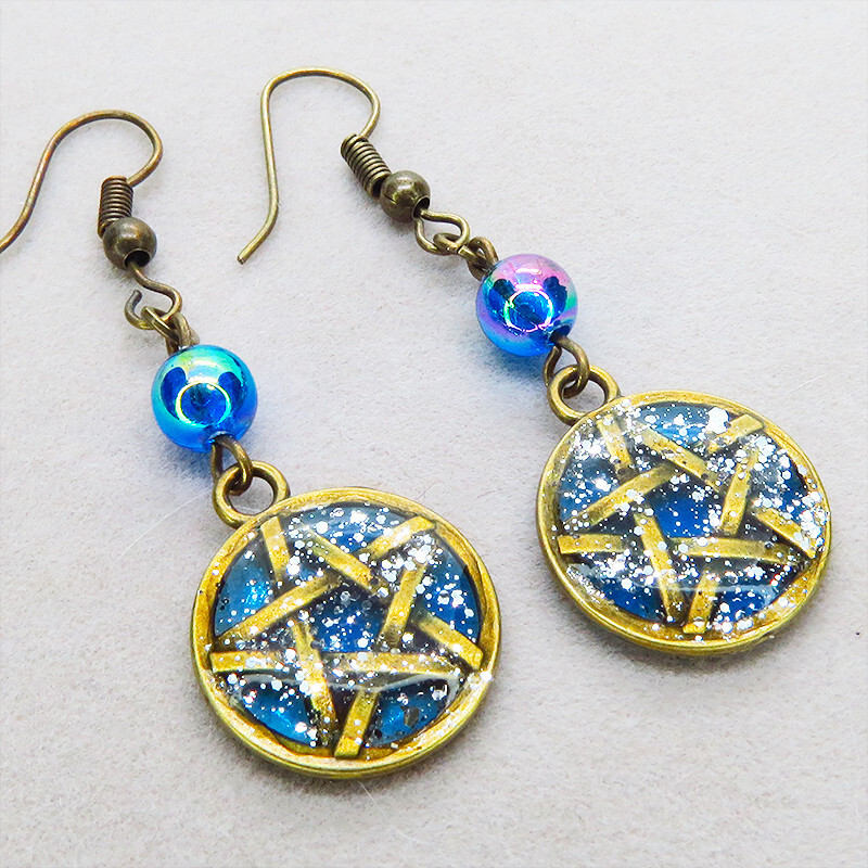 - アンティークゴールド ブルーレジンペンタグラムのピアス クリアブルービーズ