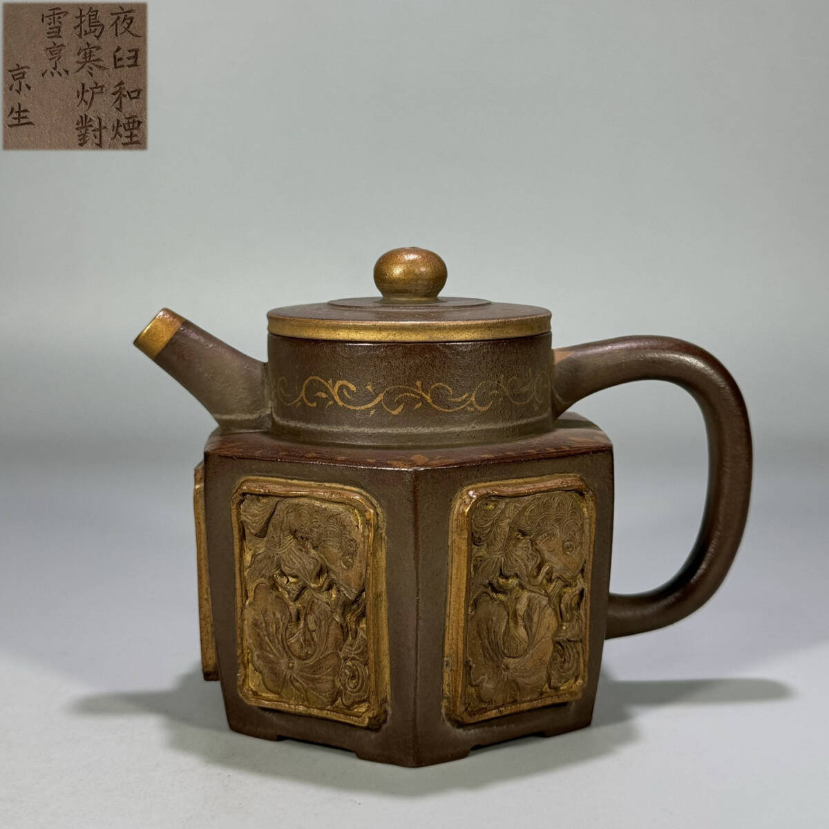 - 古陶芸 紫砂壷 清時代 【京生】 製 「天円地方貼絵堆金六方壺」 紫泥 煎茶 急須 茶道具 唐物 時代物 茶器 容量360cc LT-241134