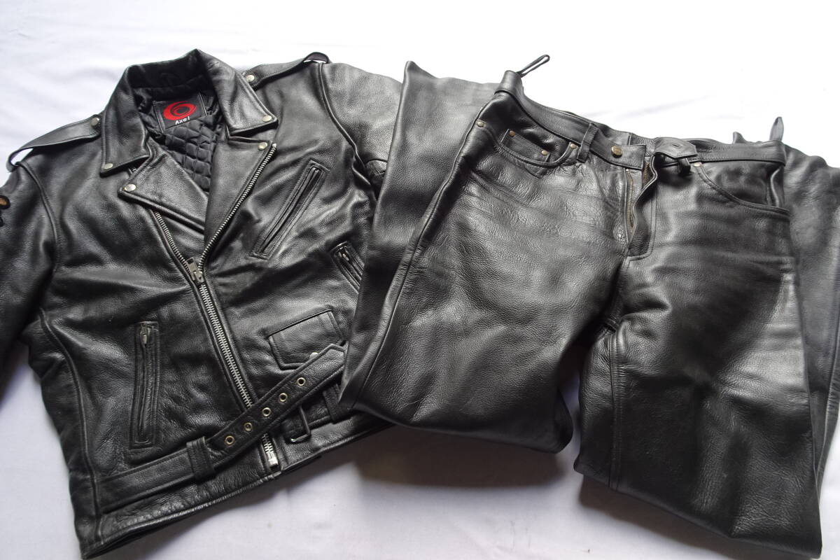 - Axel/アクセル/バイクウェア/上下セットアップ/レザー/牛革/ダブルライダースジャケット/長パンツ/黒/ブラック/XXXLサイズ(11/7R)