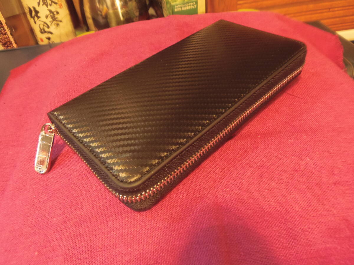 - 長財布 カーボンレザー ラウンドファスナー ロングウォレット 革財布 小銭入れジッパーL形 未使用品 ブラック/オレンジ