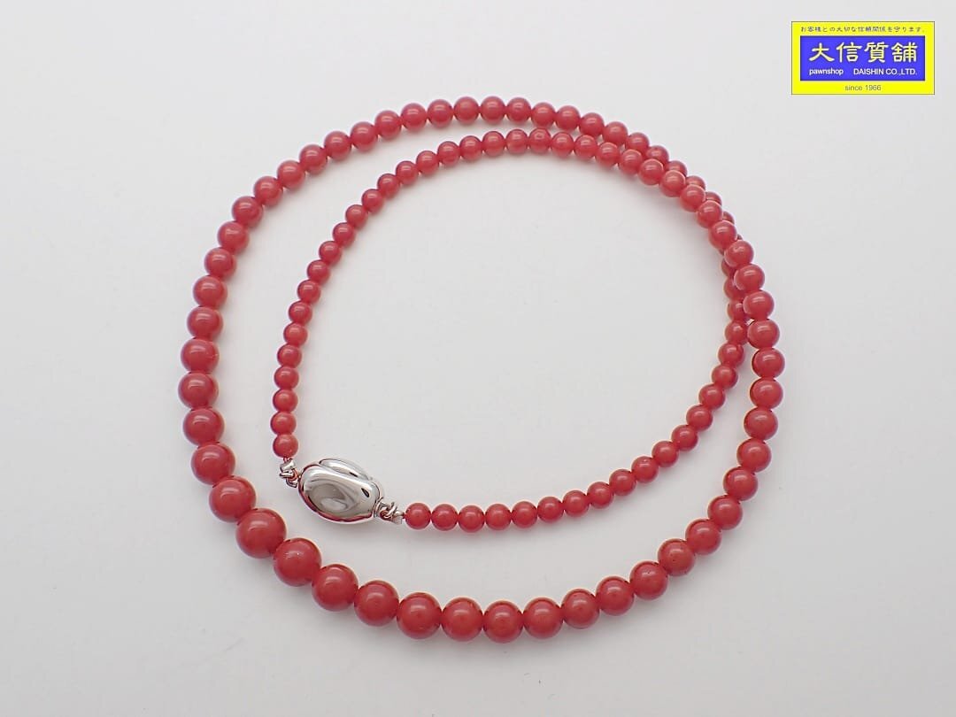 - 天然 赤珊瑚 さんご ネックレス 3.5-6.6mm珠 45.5cm 13.9g シルバークラスプ 新品同様品 【送料無料】 C-9066