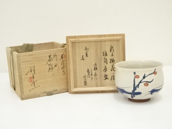- ys7201879; 丹波焼 祥公窯造 流水梅花の絵 塩笥茶碗(共箱)(書付有)【道】