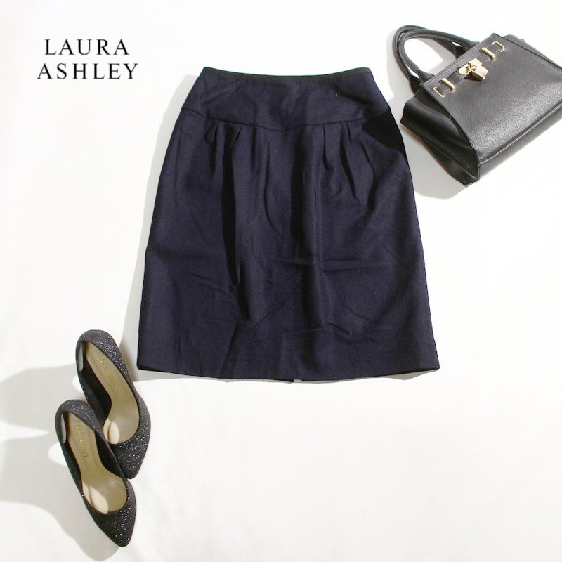 - 美品 ローラアシュレイ Laura Ashley London 秋 冬 毛 シンプル Aライン フレアスカート 1 ネイビー 紺 通勤 オフィス ビジネス フォーマル