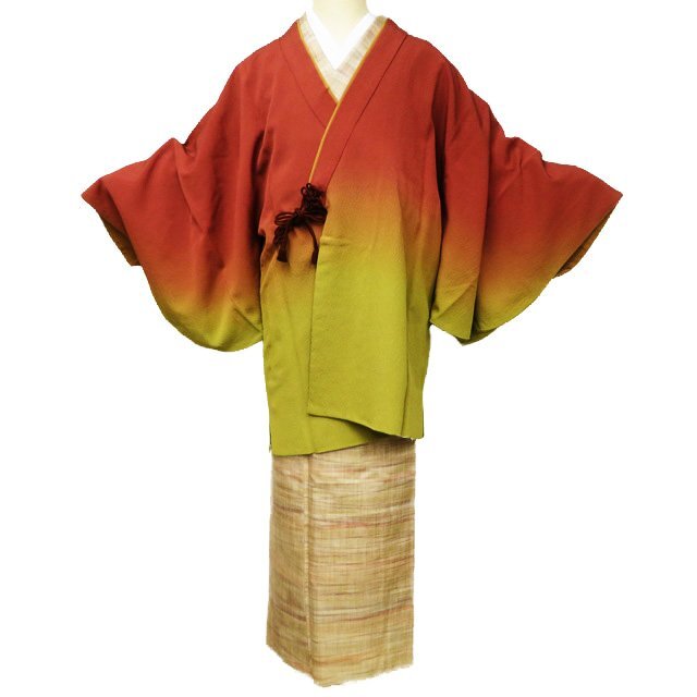 - コート 道中着 着物 中古 正絹 縮緬地 暈し 樺色 黄土色 身丈85cm 裄66.5cm きもの北條 A1118-5