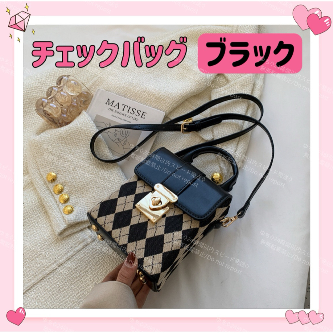 > チェック ミニ マルチ ショルダー ハンド バッグ 2way 斜め掛け 肩掛け ポシェット ポーチ シンプル レトロ オシャレ 可愛い ブラック