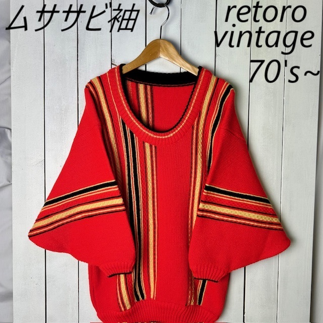 > 昭和レトロ古着 70s~ ムササビ袖 ゆったり ランダムストライプニットセーター 朱赤 オールド ヴィンテージ アクリル ウール 着物用 ●227