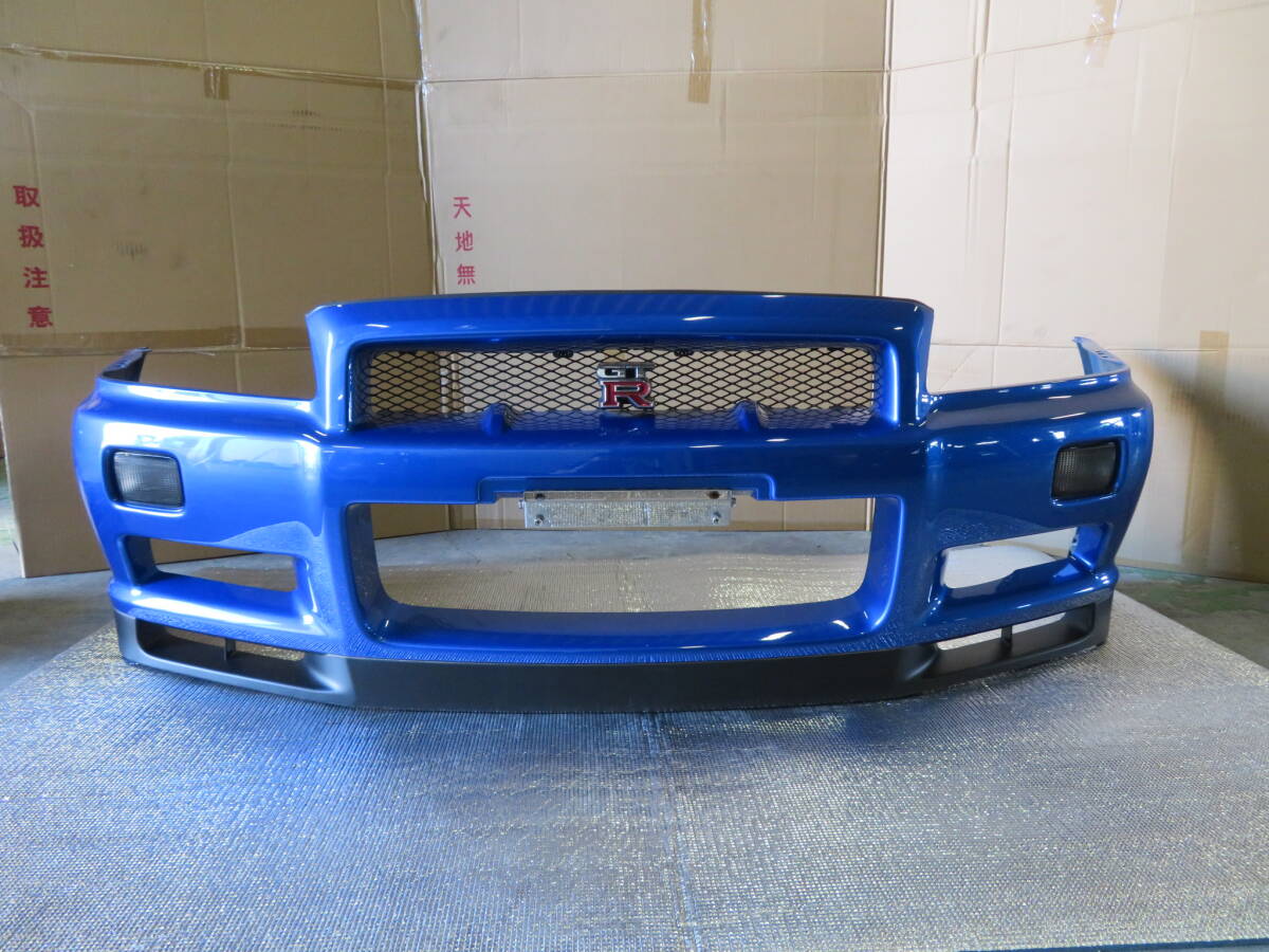 > 日産 BNR34 GTR 34 純正 フロント バンパー 純正OP リップスポイラー グリルエンブレム ナンバーステー ウィンカー付 ブルー TV2 H429