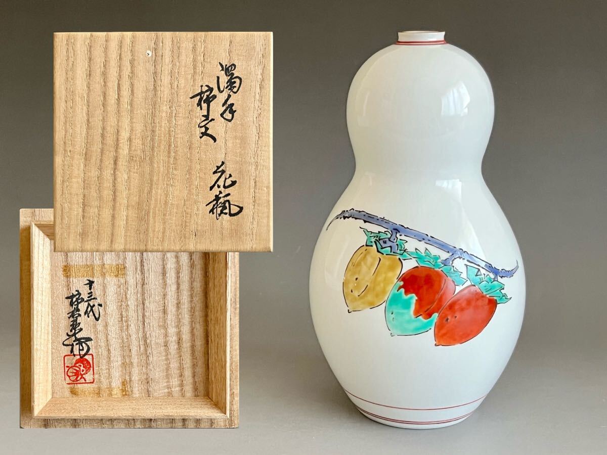 - ● 人間国宝 十三代 酒井田柿右衛門 濁手 柿文 花瓶 瓢形 花入 花器